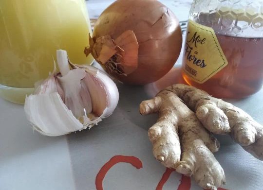 Y finalmente para prepararlo debes seguir los pasos que te indicamos a continuación. Media cebolla morada 4 rodajas pequeñas de jengibre 2 rajas de canela entera miel de abeja y un limón. 3 dientes de Ajo.